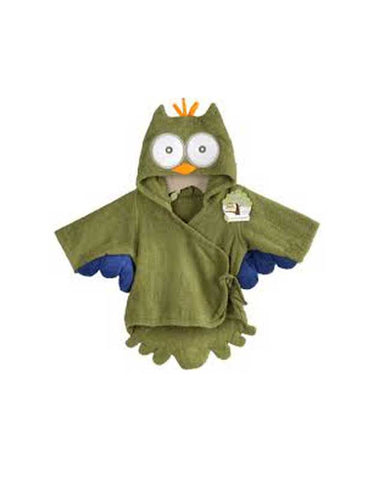 Forest green terry robe with two terry ties in front, a hood with ears and two big owl eyes, an orange crest and beak, blue scalloped "wings" along the sleevesåÊand scalloped bottom to look like tail feathers